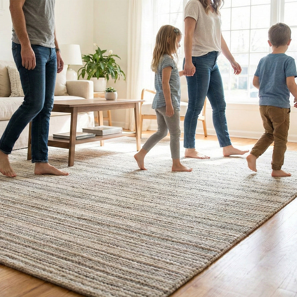 Homes with dogs or cats need surfaces that work with real activity. This rug features a low-pile, tightly woven texture that prevents pet hair from embedding deeply into the fibers. Fur stays closer to the surface, making vacuuming faster and more efficient.